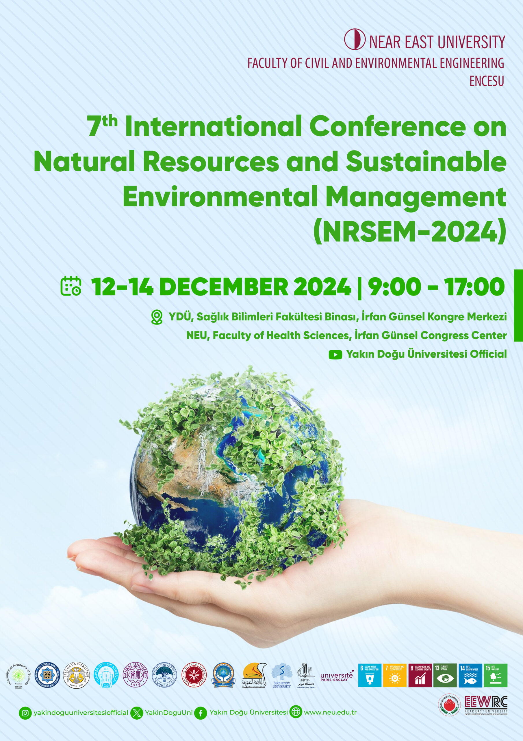 The NRSEM-2024 is a good opportunity to improve the understanding and implementation of strategies for environmental conservation and sustainable management of natural resources. This conference has several objectives. First and foremost, it provides an opportunity for researchers, academics, practitioners and policy makers to share the latest findings, creative solutions and best practices in the field of environmental sustainability and natural resource management. The conference encourages interdisciplinary discussion and collaboration, which drives the development of comprehensive solutions to pressing environmental problems. In addition, the conference aims to raise public awareness of the importance of protecting natural resources and reducing environmental degradation. It encourages and empowers individuals and institutions to promote environmentally conscious practices and policies in their respective fields by sharing research findings and real-world experiences. In addition, the conference enables the achievement of the Sustainable Development Goals at local, national and global levels by promoting international cooperation and partnerships. NRSEM-2024 is the seventh meeting in the series of international conferences on European Environmental Policy and the Case of Cypriot Mines (EEPCCM-2001), Environmental Problems of the Mediterranean (EPMR-2002), Environment: Survival and Sustainability (ESS-2007, ESS-2019) and the fifth and sixth International Conferences on Natural Resources and Sustainable Environmental Management (NRSEM-2021 and NRSEM-2023 respectively), which build on the successful outcomes of the Near East University. The importance of NRSEM-2024 cannot be overstated in today's world, where climate change, biodiversity loss and resource depletion are among the main risks to human well-being and environmental integrity. It is a vision of hope and progress that inspires everyone to act and strengthens our collective resolve to create a more resilient, just and sustainable future for generations to come. Listener registration fee: conference attendance on 12-14 December, 2024. The early bird registration deadline: 10/30/2024. Cancellation Policy: 70% refund for cancellations received before and on 30th of November, 2024; an administrative fee of 30% registration fee will be applied. NO REFUNDS for cancellation on and after 30th of November, 2024.