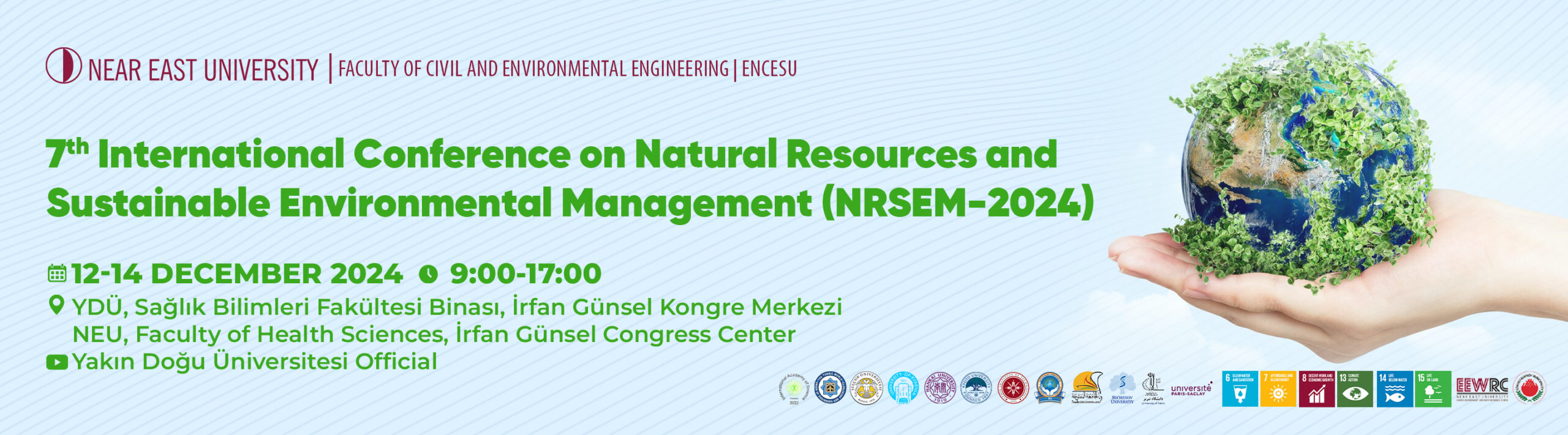 The NRSEM-2024 is a good opportunity to improve the understanding and implementation of strategies for environmental conservation and sustainable management of natural resources. This conference has several objectives. First and foremost, it provides an opportunity for researchers, academics, practitioners and policy makers to share the latest findings, creative solutions and best practices in the field of environmental sustainability and natural resource management. The conference encourages interdisciplinary discussion and collaboration, which drives the development of comprehensive solutions to pressing environmental problems. In addition, the conference aims to raise public awareness of the importance of protecting natural resources and reducing environmental degradation. It encourages and empowers individuals and institutions to promote environmentally conscious practices and policies in their respective fields by sharing research findings and real-world experiences. In addition, the conference enables the achievement of the Sustainable Development Goals at local, national and global levels by promoting international cooperation and partnerships. NRSEM-2024 is the seventh meeting in the series of international conferences on European Environmental Policy and the Case of Cypriot Mines (EEPCCM-2001), Environmental Problems of the Mediterranean (EPMR-2002), Environment: Survival and Sustainability (ESS-2007, ESS-2019) and the fifth and sixth International Conferences on Natural Resources and Sustainable Environmental Management (NRSEM-2021 and NRSEM-2023 respectively), which build on the successful outcomes of the Near East University. The importance of NRSEM-2024 cannot be overstated in today's world, where climate change, biodiversity loss and resource depletion are among the main risks to human well-being and environmental integrity. It is a vision of hope and progress that inspires everyone to act and strengthens our collective resolve to create a more resilient, just and sustainable future for generations to come. Listener registration fee: conference attendance on 12-14 December, 2024. The early bird registration deadline: 10/30/2024. Cancellation Policy: 70% refund for cancellations received before and on 30th of November, 2024; an administrative fee of 30% registration fee will be applied. NO REFUNDS for cancellation on and after 30th of November, 2024.